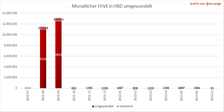 Diese Grafiken zeigen die Anzahl der HIVE, die durch den Umwandlungsprozess effektiv genutzt werden (HIVE umgewandelt und 5% HIVE-Gebühr, die verbrannt wird) jeden Tag und Monat, wenn Anfragen zur Umwandlung von HIVE in HBD abgeschlossen wurden.