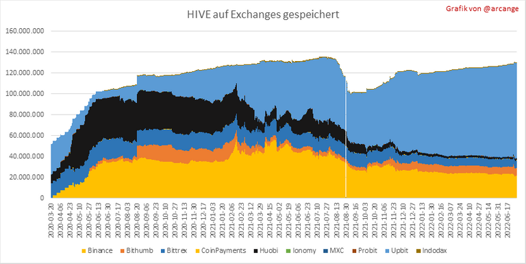 Diese Grafiken zeigen die Menge und Verteilung von HIVE und HBD, die an den Exchanges gespeichert sind, an denen sie gelistet sind.