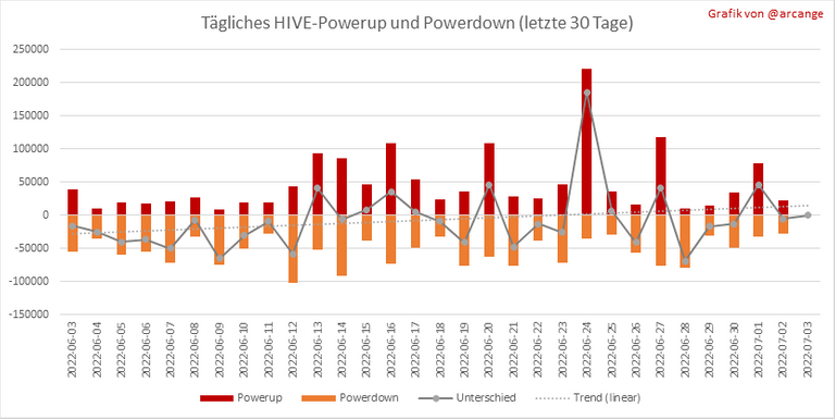 Diese Grafik zeigt das tägliche Powerup und Powerdown des HIVE und die resultierende Variation in den letzten 30 Tagen. Die Tabelle zeigt die Top-Powerups und Powerdowns des Tages.
