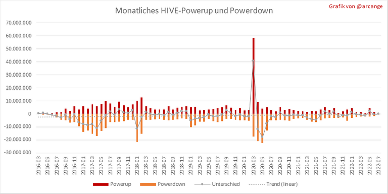 Diese Grafik zeigt das monatliche Powerup und Powerup des HIVE Token und die resultierende Variation.