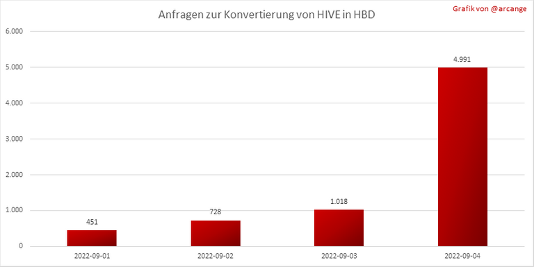 Diese Grafik zeigt die Anzahl der HIVE-Besicherungen aufgrund von Anfragen zur Umwandlung von HIVE in HBD in den letzten Tagen.