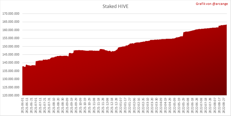 Diese Grafiken zeigen die Entwicklung des flüssigen HIVE und des staked HIVE (Hive Power).