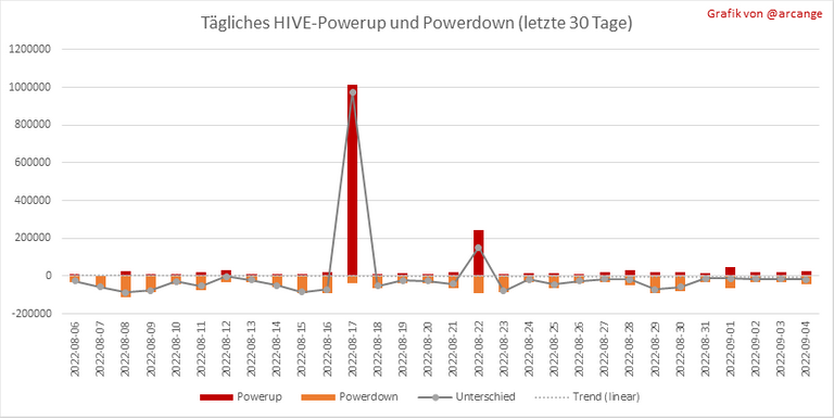 Diese Grafik zeigt das tägliche Powerup und Powerdown des HIVE und die resultierende Variation in den letzten 30 Tagen. Die Tabelle zeigt die Top-Powerups und Powerdowns des Tages.
