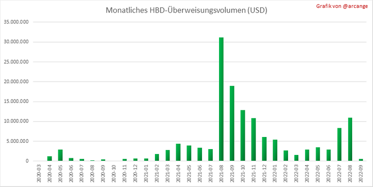 Diese Grafiken zeigen das Volumen (in USD) von HIVE und HBD, das zwischen Konten übertragen wird.