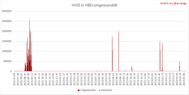 Diese Grafiken zeigen die Anzahl der HIVE, die durch den Umwandlungsprozess effektiv genutzt werden (HIVE umgewandelt und 5% HIVE-Gebühr, die verbrannt wird) jeden Tag und Monat, wenn Anfragen zur Umwandlung von HIVE in HBD abgeschlossen wurden.