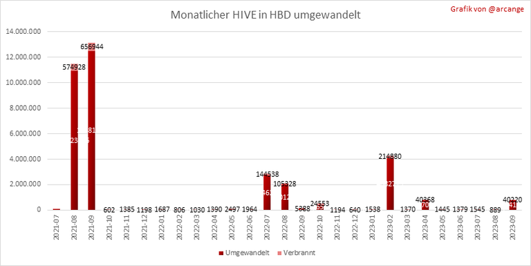 Diese Grafiken zeigen die Anzahl der HIVE, die durch den Umwandlungsprozess effektiv genutzt werden (HIVE umgewandelt und 5% HIVE-Gebühr, die verbrannt wird) jeden Tag und Monat, wenn Anfragen zur Umwandlung von HIVE in HBD abgeschlossen wurden.