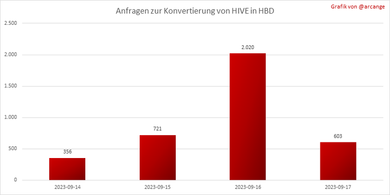 Diese Grafik zeigt die Anzahl der HIVE-Besicherungen aufgrund von Anfragen zur Umwandlung von HIVE in HBD in den letzten Tagen.