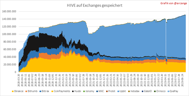 Diese Grafiken zeigen die Menge und Verteilung von HIVE und HBD, die an den Exchanges gespeichert sind, an denen sie gelistet sind.