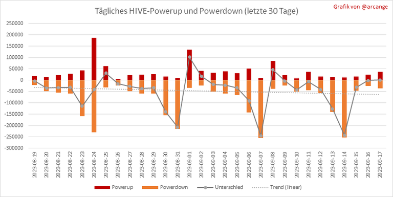 Diese Grafik zeigt das tägliche Powerup und Powerdown des HIVE und die resultierende Variation in den letzten 30 Tagen. Die Tabelle zeigt die Top-Powerups und Powerdowns des Tages.