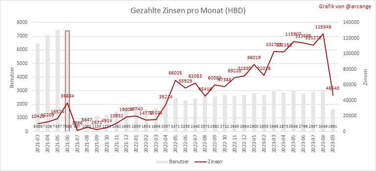 Diese Grafik zeigt die monatlich gezahlten Zinsen für das Halten von HBD und wie viele Konten diese Zinsen erhalten haben.