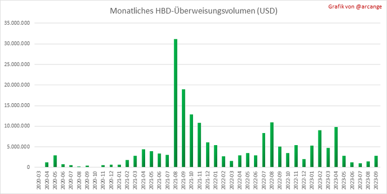 Diese Grafiken zeigen das Volumen (in USD) von HIVE und HBD, das zwischen Konten übertragen wird.
