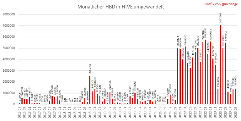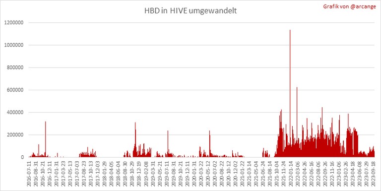 Diese Grafiken zeigen die Anzahl der HIVE, die durch den Umwandlungsprozess effektiv genutzt werden (HIVE umgewandelt und 5% HIVE-Gebühr, die verbrannt wird) jeden Tag und Monat, wenn Anfragen zur Umwandlung von HIVE in HBD abgeschlossen wurden.