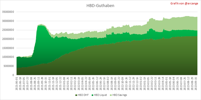 Diese Grafik zeigt die Anzahl der HIVE, sowohl liquide als auch in Ersparnissen, die von allen Konten gehalten werden. Dies zeigt auch, wie viel HBD sich im Decentralized Hive Fund (DHF) befindet.