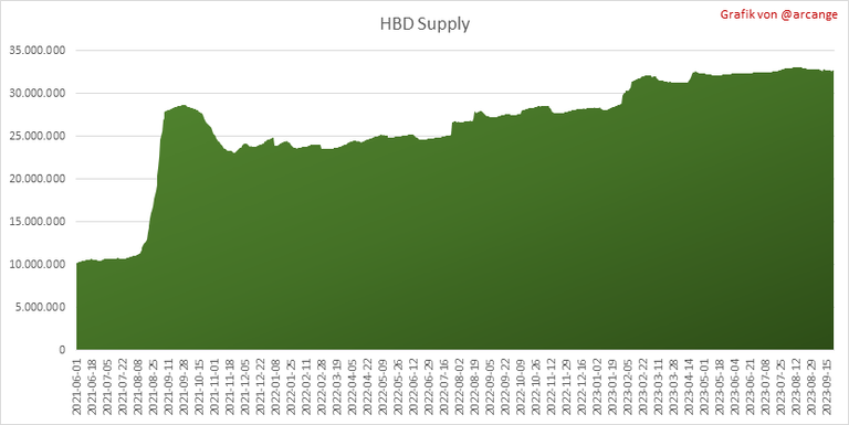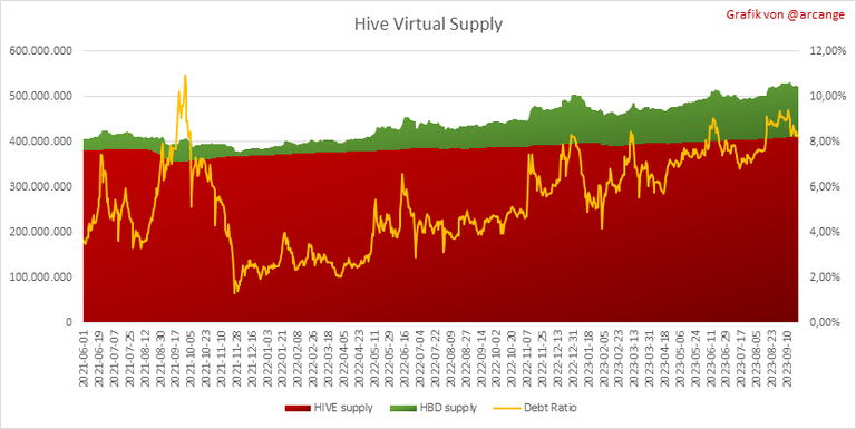 Die Grafik zeigt auch die Schuldenquote (HBD-Angebot / HIVE virtuelles Angebot). Bitte beachten, dass seit des Hardfork 24 die Treasury-Fonds von Hive (@hive.fund HBD-Saldo) nicht in der HBD-Schuldenquote berücksichtigt werden.