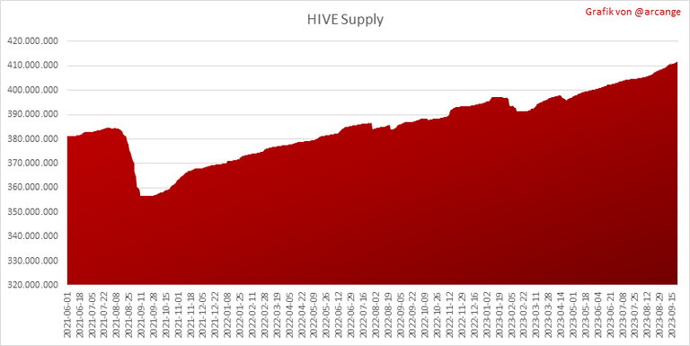 Diese Grafik zeigt die Entwicklung des virtuellen HIVE-Angebot. Das virtuelle Angebot ist die Summe aus HIVE-Angebot (flüssiges oder staked HIVE) und HBD-Angebot (umgerechnet in HIVE).