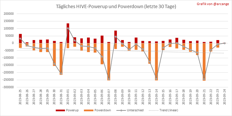 Diese Grafik zeigt das tägliche Powerup und Powerdown des HIVE und die resultierende Variation in den letzten 30 Tagen. Die Tabelle zeigt die Top-Powerups und Powerdowns des Tages.