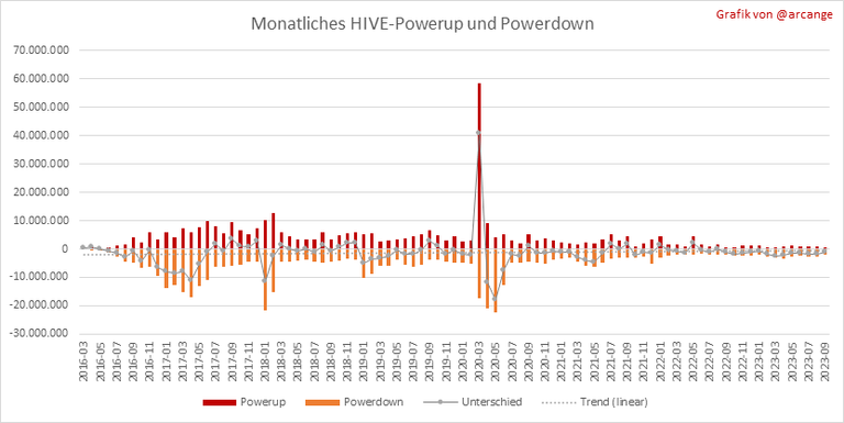 Diese Grafik zeigt das monatliche Powerup und Powerup des HIVE Token und die resultierende Variation.