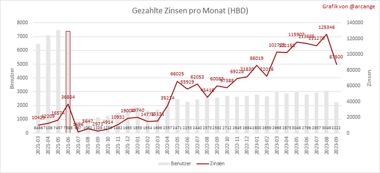 Diese Grafik zeigt die monatlich gezahlten Zinsen für das Halten von HBD und wie viele Konten diese Zinsen erhalten haben.