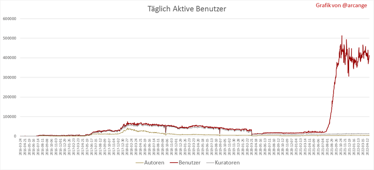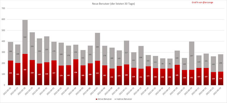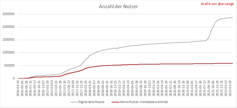 Diese beiden Grafiken zeigen, wer am letzten Tag neue Konten erstellt hat, und die Gesamtzahl der registrierten Konten. Die rote Linie zeigt an, wie viele der Konten mindestens einmal aktiv waren (aktiv bedeutet, einen Beitrag zu veröffentlichen, zu kommentieren oder zu voten). Sie zählen dazu, auch wenn sie später inaktiv werden.