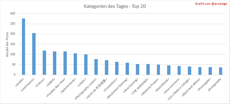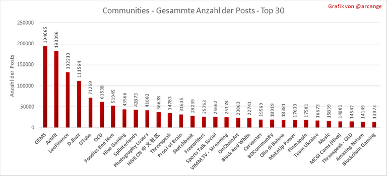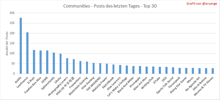 Diese Grafiken zeigen die aktivsten Communitys nach Anzahl der Beiträge (Über die gesamte Blockchain-Lebensdauer und am letzten Tag).
