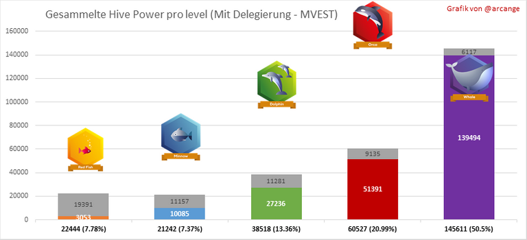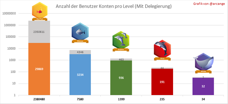Diese Grafik zeigt die Verteilung der Hive Power pro Kontolevel. Das linke Diagramm zeigt die Verteilung ohne Berücksichtigung von Delegierungen, die von den Konten vorgenommen oder empfangen wurden. Die rechten Diagramme berücksichtigen die Delegierung, fügen die empfangene HP-Delegierung hinzu und subtrahieren die abgegebene HP-Delegierung.