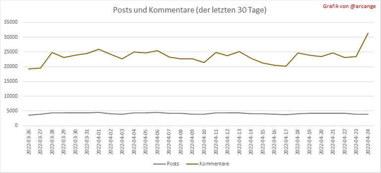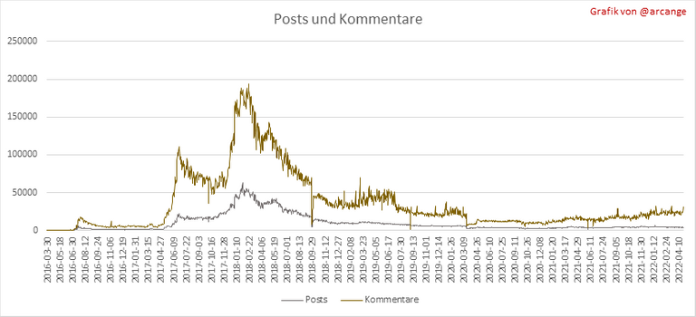 Diese Grafiken zeigen die Entwicklung von Posts und Kommentaren über die gesamte Blockchain-Lebensdauer und der letzten 30 Tage.