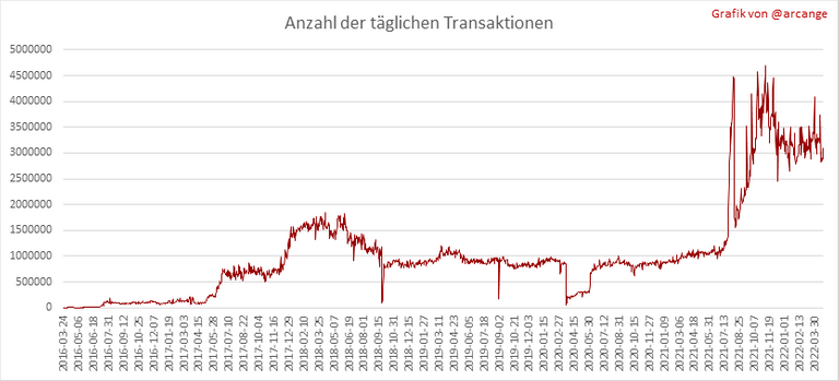 Diese Tabelle zeigt die Anzahl der neu registrierten Benutzer auf der Blockchain und wie viele von ihnen aktiv sind. Das Diagramm ist dynamisch! Ein Benutzer kann sich an einem Tag registrieren und erst ein paar Tage später aktiv werden. Daher kann sich die Anzahl der aktiven Benutzer an einem bestimmten Datum von Tag zu Tag ändern.