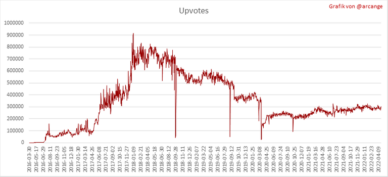 Diese Grafiken zeigen die Entwicklung der Kuration (Upvotes) über die gesamte Blockchain-Lebensdauer und der letzten 30 Tage.