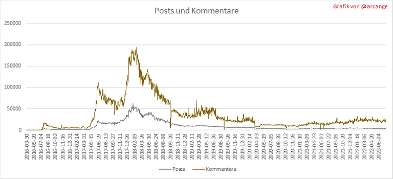 Diese Grafiken zeigen die Entwicklung von Posts und Kommentaren über die gesamte Blockchain-Lebensdauer und der letzten 30 Tage.
