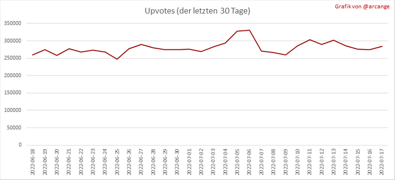 Diese Grafiken zeigen die Entwicklung der Kuration (Upvotes) über die gesamte Blockchain-Lebensdauer und der letzten 30 Tage.