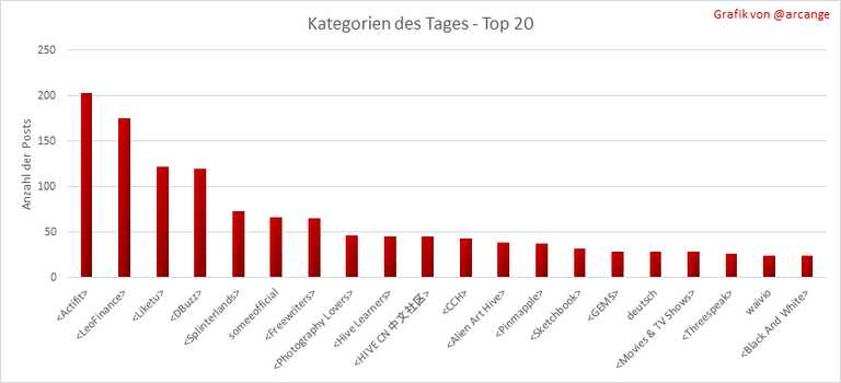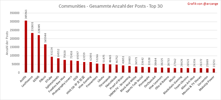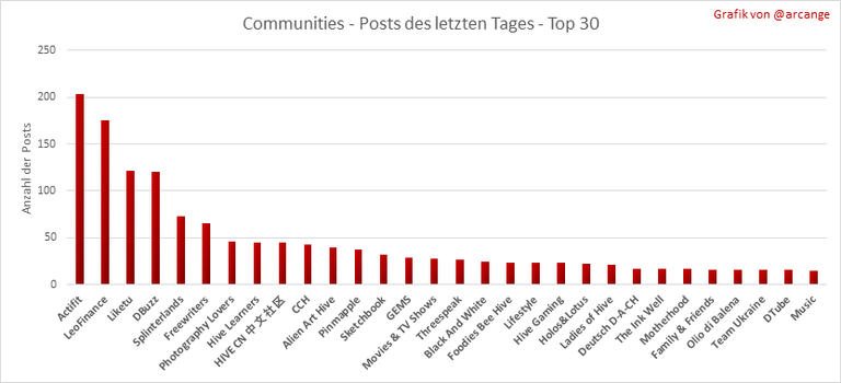 Diese Grafiken zeigen die aktivsten Communitys nach Anzahl der Beiträge (Über die gesamte Blockchain-Lebensdauer und am letzten Tag).