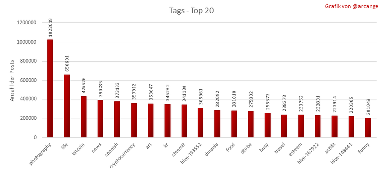 Diese Grafiken zeigen, welche Haupt-Tags für die Veröffentlichung von Posts über die gesamte Blockchain-Lebensdauer und am letzten Tag am häufigsten verwendet wurden.