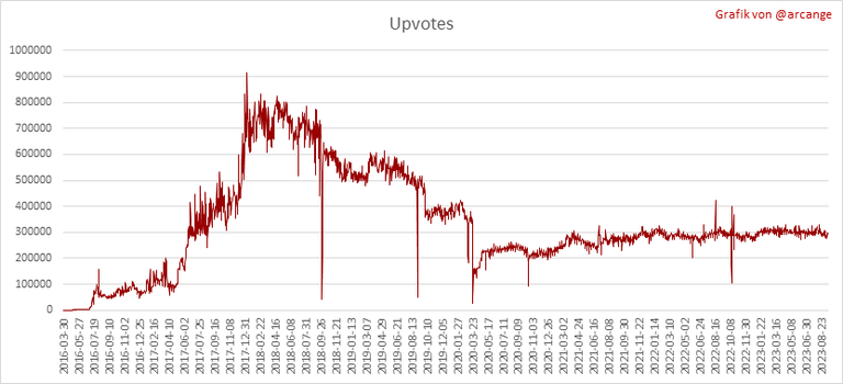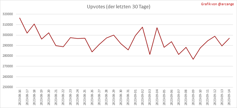 Diese Grafiken zeigen die Entwicklung der Kuration (Upvotes) über die gesamte Blockchain-Lebensdauer und der letzten 30 Tage.