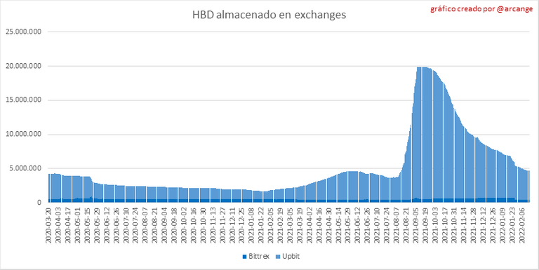 Estos gráficos muestran la evolución diaria de HIVE y HBD almacenados en los exchanges donde se enumeran.