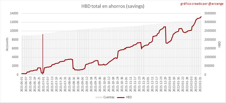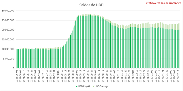Este gráfico muestra el número de HBD, liquido y en ahorros, en todas las cuentas.