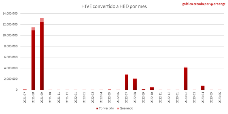 Estos gráficos muestran el número de HIVE realmente utilizado por el proceso de conversión (HIVE convertido + 5% HIVE fresco que se destruye) cada día y cada mes después de que se hayan finalizado las solicitudes de conversión de HIVE a HBD.