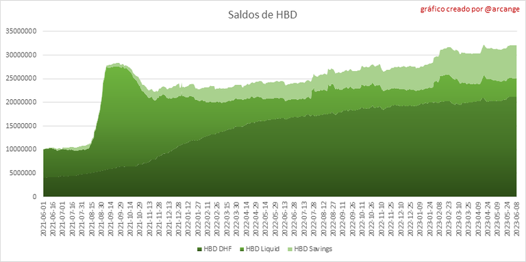 Este gráfico muestra el número de HBD, liquido y en ahorros, en todas las cuentas. Este también muestra cuánto HBD hay en el Decentralized Hive Fund (DHF).