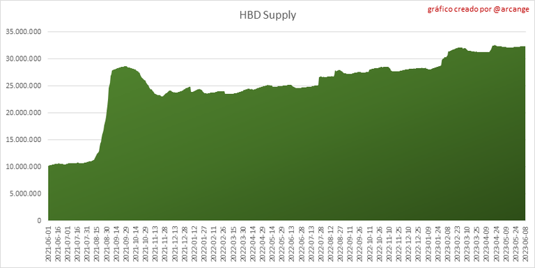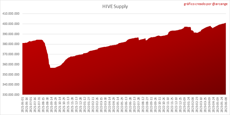Este gráfico muestra la evolución de la oferta virtual de HIVE. La oferta virtual (Virtual Supply) es la suma de la oferta en HIVE (líquida o bloqueada en Hive Power) y la oferta en HBD (convertida en HIVE).