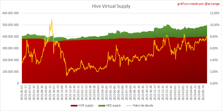 El gráfico también muestra el ratio de endeudamiento (oferta HBD / oferta virtual HIVE). Tenga en cuenta que desde el hardfork 24, los fondos en la cuenta de tesorería de Hive ([balance HBD de @hive.fund] (https://peakd.com/@hive.fund/wallet)) no se toman en cuenta en la proporción de deuda.