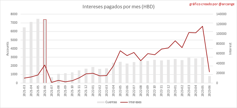 Este gráfico muestra el interés pagado mensualmente por mantener HBD y cuántas cuentas recibieron ese interés.