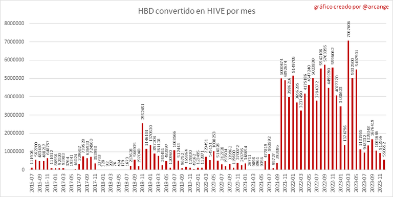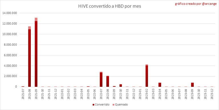 Estos gráficos muestran el número de HIVE realmente utilizado por el proceso de conversión (HIVE convertido + 5% HIVE fresco que se destruye) cada día y cada mes después de que se hayan finalizado las solicitudes de conversión de HIVE a HBD.