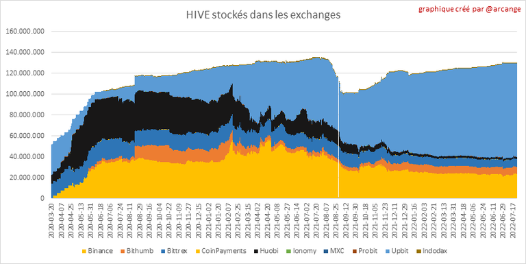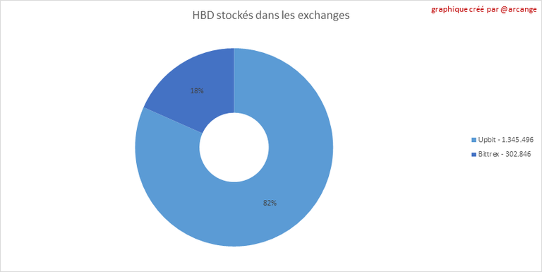 Ces graphiques montrent la quantité et la répartition de HIVE et de HBD stockés dans les exchanges où ils sont cotés.