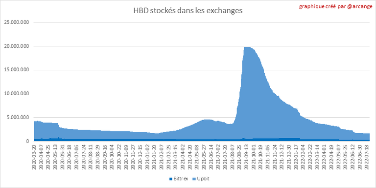 Ces graphiques montrent l'évolution journalière de HIVE et de HBD stockés dans les exchanges où ils sont cotés.