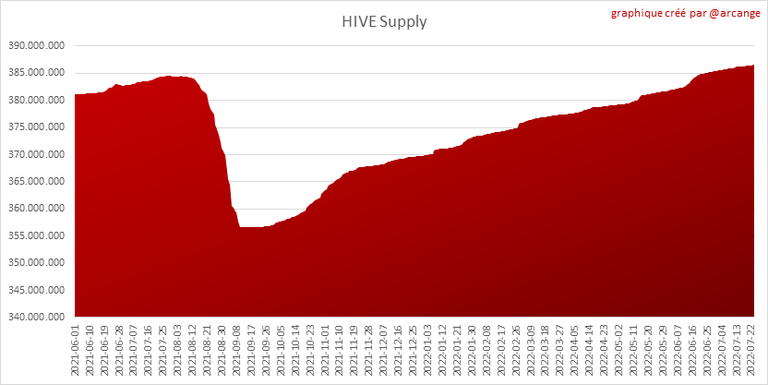 Ce graphique montre l'évolution de l'offre virtuelle de HIVE. L'offre virtuelle (Virtual Supply) est la somme de l'offre en HIVE (liquides ou bloqués en Hive Power) et de l'offre en HBD (convertie en HIVE).