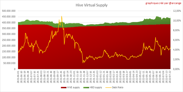 Le graphique affiche également le ratio d'endettement (offre HBD / offre virtuelle HIVE). Gardez à l'esprit que depuis le hardfork 24, les fonds de trésorerie de Hive (balance @hive.fund HBD) n'interviennent pas dans le ratio d'endettement.