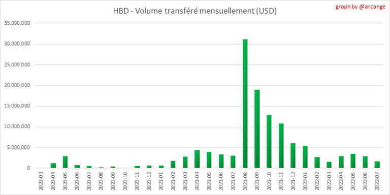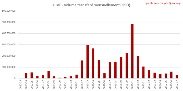 Ces graphiques montrent le volume (en USD) de HIVE et HBD transféré entre les comptes.