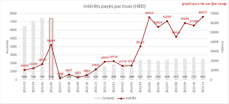 Ce graphique montre le montant des intérêts payés chaque mois pour la détention de HBD et combien de comptes ont reçu ces intérêts.