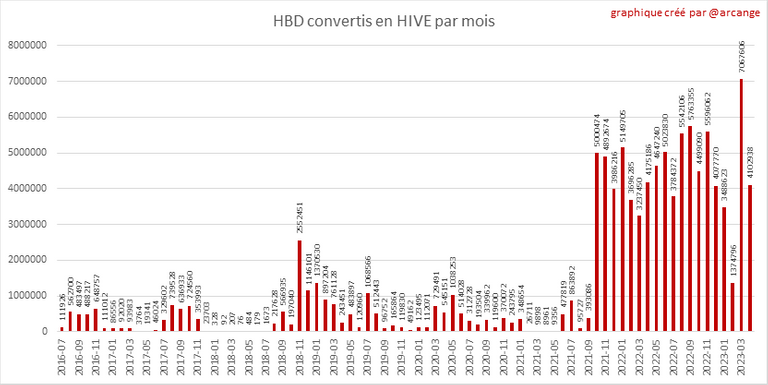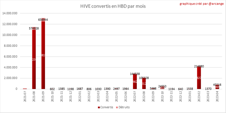 Ces graphiques montrent le nombre de HBD détruits, chaque jour et chaque mois, suite aux demandes de conversion de HBD en HIVE.