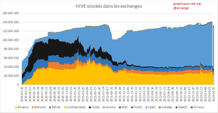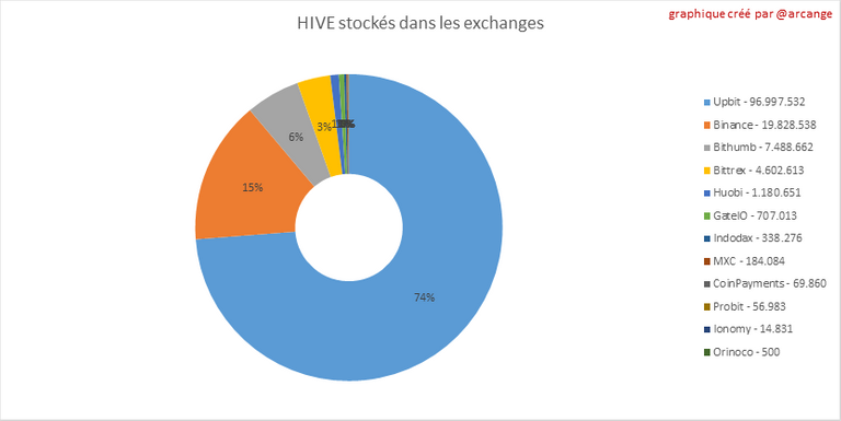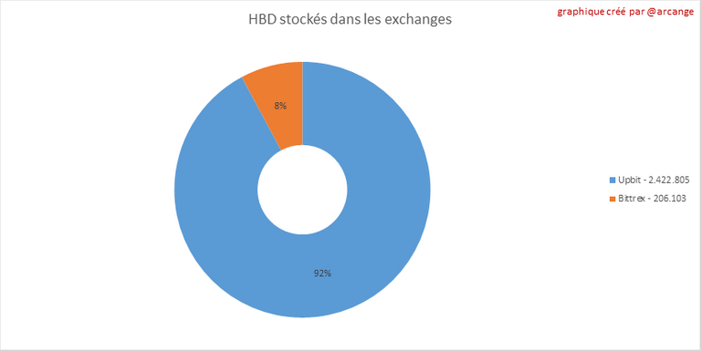 Ces graphiques montrent la quantité et la répartition de HIVE et de HBD stockés dans les exchanges où ils sont cotés.