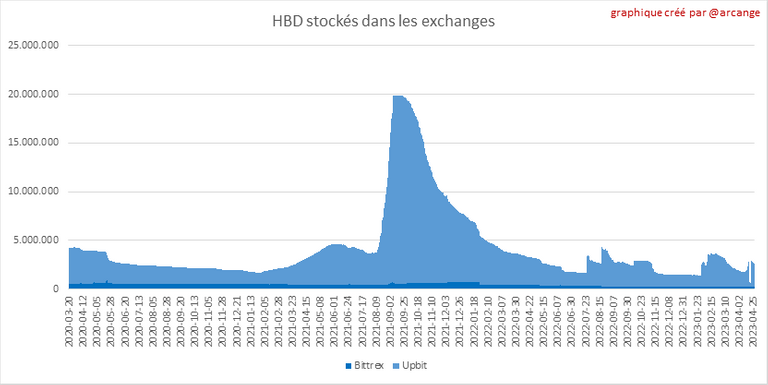 Ces graphiques montrent l'évolution journalière de HIVE et de HBD stockés dans les exchanges où ils sont cotés.